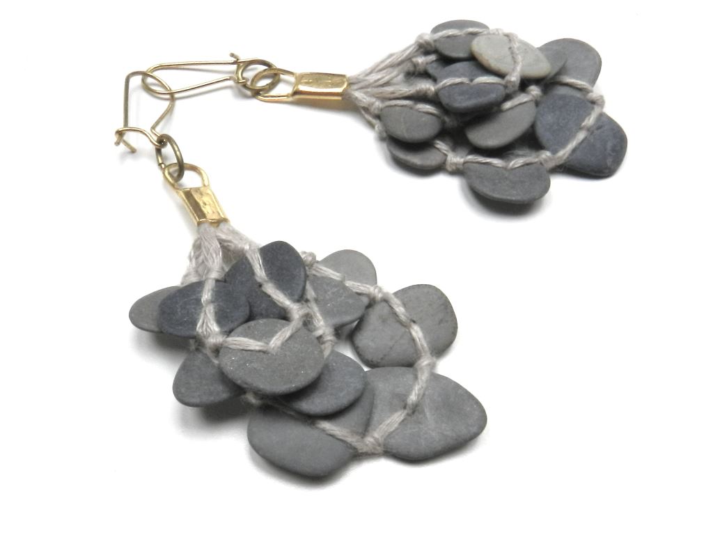 Boucles d'oreilles en petites pierres d'ardoise et fils de lin