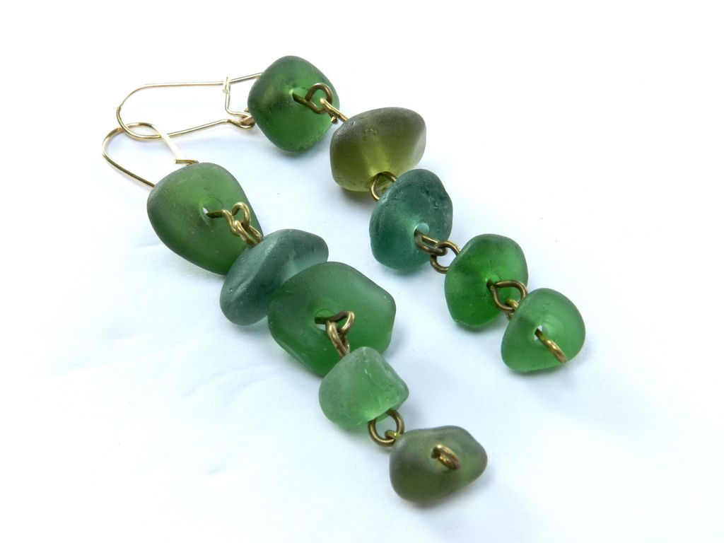 Boucles d'oreilles en tout petits galets de verre dépolis dans les tons verts
