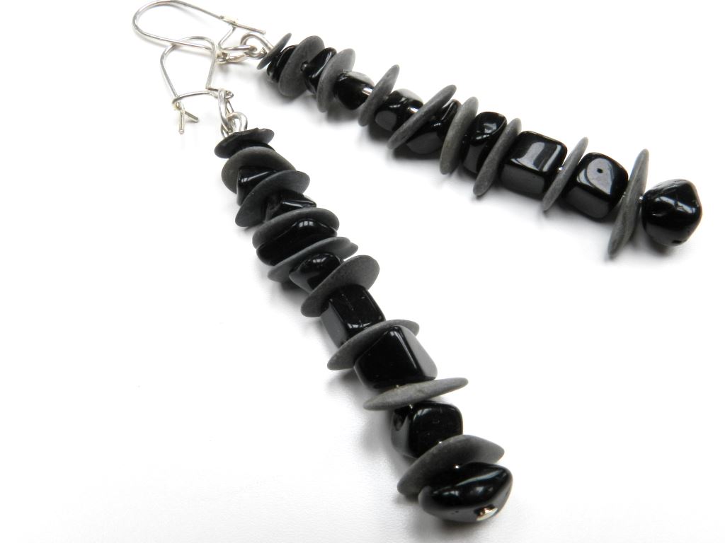 Boucles d'oreilles en petites pierres d'ardoise et perles de verre noires brillantes