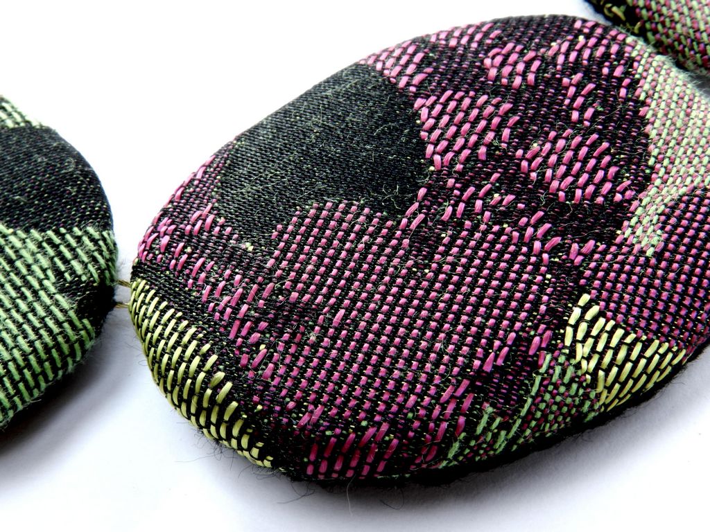 Collier composé de 5 galets recouverts de tissu dans les tons de violet, différents tons de verts et de noir
