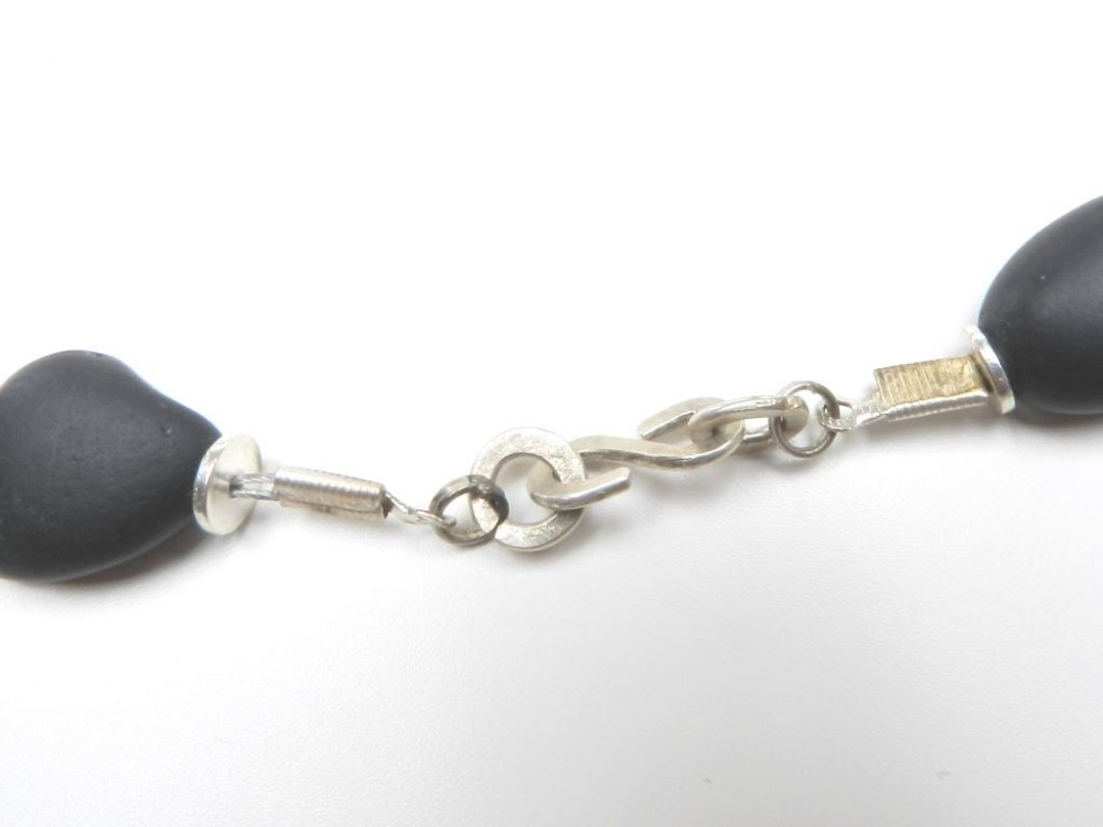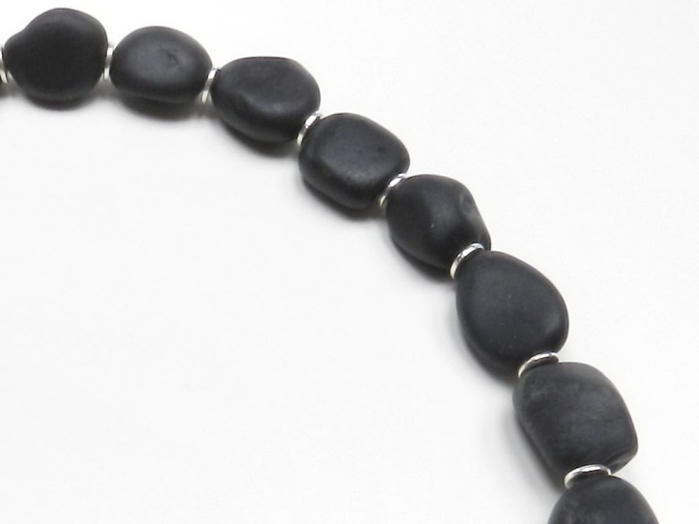 Collier composé de perles de pierre de grès noir, intercalées de métal argenté