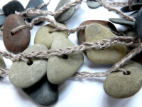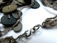 Collier en petites pierres de couleurs grises, beiges et rouges et fils de lin et fils de pêche crochetées